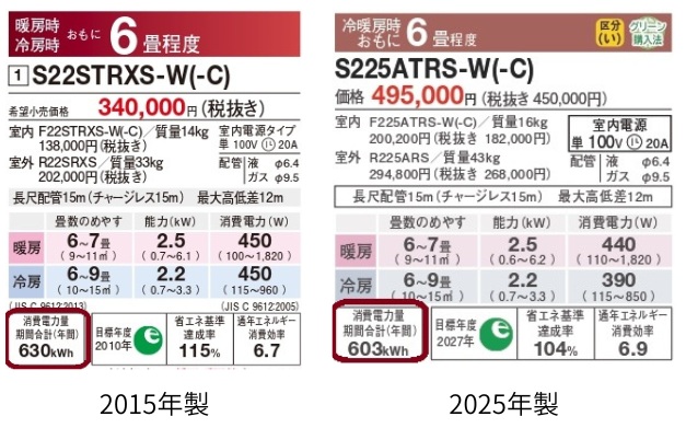 結論:省エネ(APF・年間消費)は微改善ですが、価格差は大きめ。省エネ回収目的だけなら買い替えの費用対効果は限定的です。