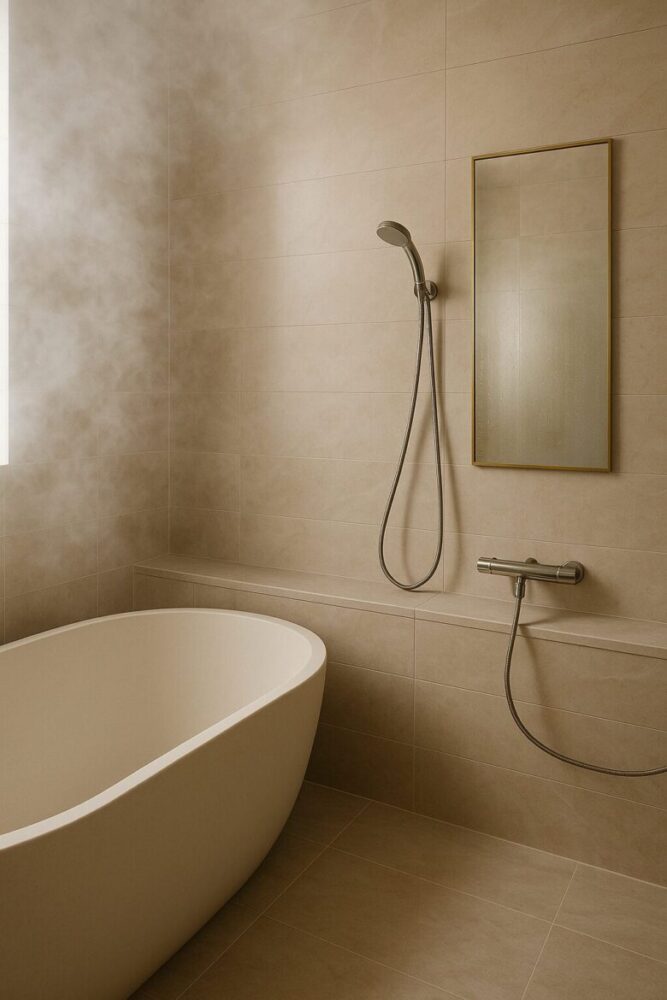 湯気で湿気がこもり、鏡も壁も水滴だらけ。