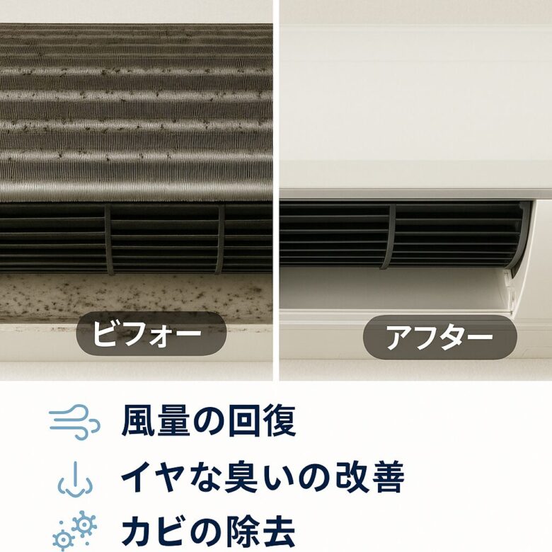 どちらも大事な機能ですが、エアコン内部の汚れまでは取れません。