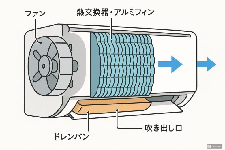 エアコンの内部には、風を送るファンや水分を受けるドレンパンがあります。