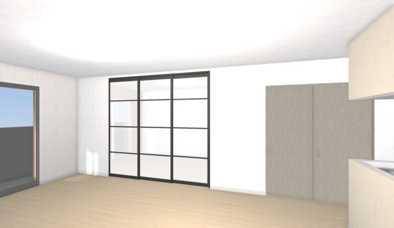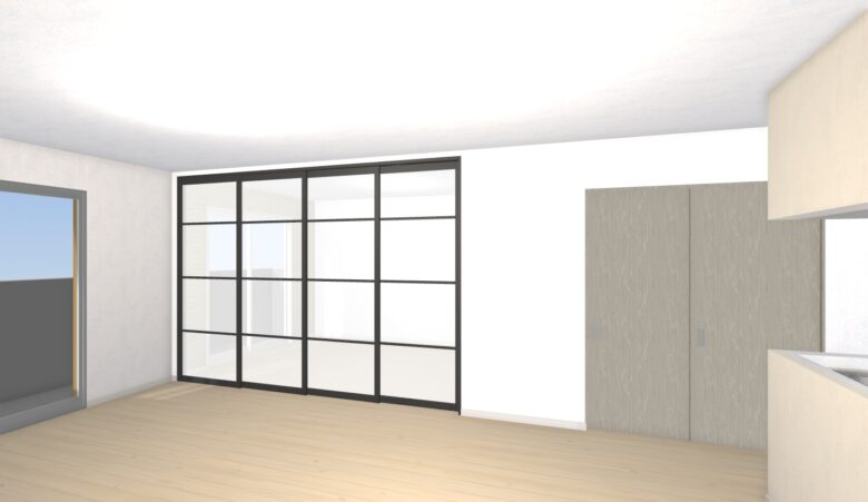 例えばこちらはリビングと隣接する洋室を4枚のアルミ扉で仕切ったケースです。